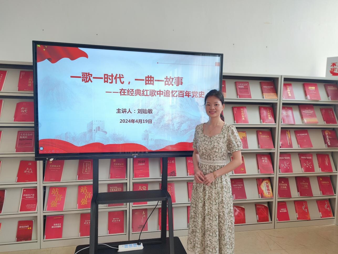 4月19日下午5:00,刘贻敏老师在图书馆三楼“红色阅读角” 举办红色知识专题讲座,本期讲座的主题是一歌一时代,一曲一故事——在经典红歌中追忆百年党史。(张新玲摄)