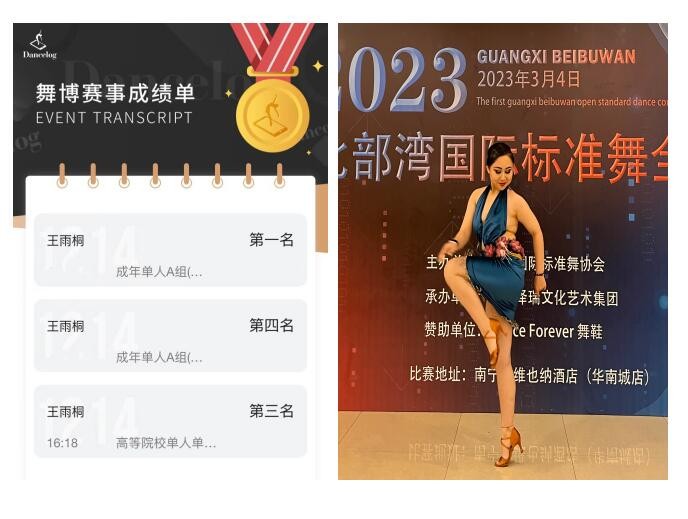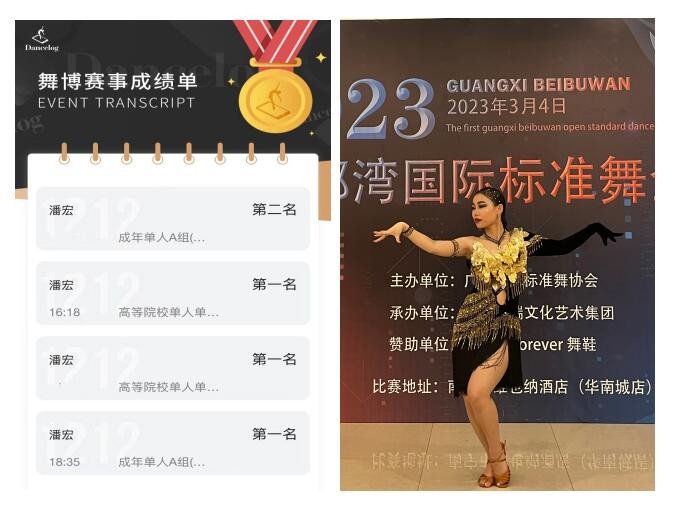 2023年3月4日,中国·广西首届北部湾国际标准舞全国公开赛在广西南宁正式开赛。由人文教育学院舞蹈表演专业(国标舞兼修)学生潘宏、丁小丫、王雨嫣、王雨桐组成的北海艺术设计学院国标舞代表队,在青年教师李晓飞和周琦涵的带领下出战,一举斩获8项冠军、2项亚军、2项季军、1项殿军。