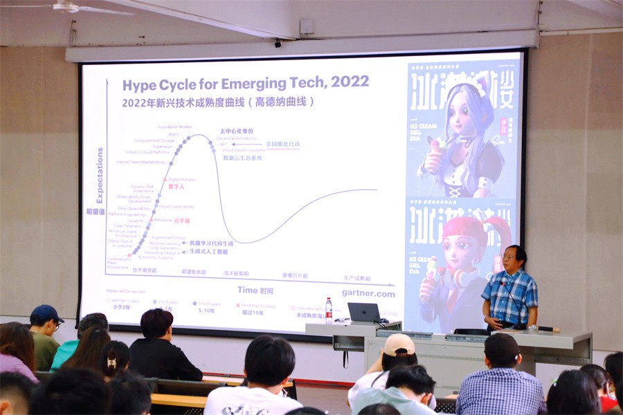 随后,李四达教授从五个方面提出了当下科技艺术设计构成的挑战和发展趋势。第一,人工智能生成技术的挑战引起人们对一个更全面的智能时代艺术与科技的思考,也让大家看到了数字媒体艺术广阔的前景并对这个行业充满了信心与期待。第二,拓展现实的挑战,拓展现实仿真技术催生出全新的生活方式。元宇宙的兴起更预示着虚拟商品的发展前景广阔,李四达教授用多个例子证明元宇宙是真实世界的翻版或延伸,让人们突破物理界限创造可能。第三,虚实共生的挑战,数字孪生与虚拟人技术,将大有可为,成为数字媒体艺术今后发展必须面对的挑战。第四,虚拟产品的挑战由2022年新兴技术成熟度高德纳曲线可以看出,数字人未来发展前途无量,值得期待。第五,大数据美学与文化的思考,新媒体艺术的科技特性创造了一种互交的、对话式的观看方式,突出艺术作品的“对话性”和观察者的参与感。李四达教授表示,现当下新媒体艺术在行为层与文化层的深度设计仍有不足,他通过奥拉维尔·埃利亚松的代表作《气候计划》,启迪大家要把行为层与文化层的思想与观念融入作品创作。