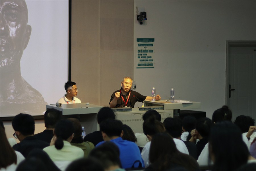 王少军教授通过展示他个人的一系列雕塑作品,讲述作品创作过程中的心路历程及作品对自身发展的影响,从而深入探讨雕塑艺术,说明具象写实雕塑的作用和意义。王少军教授表示写实艺术永远具有生命力,存在于人类社会的需求之中,他在此基础上尝试不断创新和探索,从中找出更新的意义,进而奠定了“角儿”这一艺术观念的基础。在雕塑技艺的基础分享上,他鼓励大家要脱离雕像写实的功能,用雕塑的语言超越现实的边界,将雕塑的灵魂可视化。