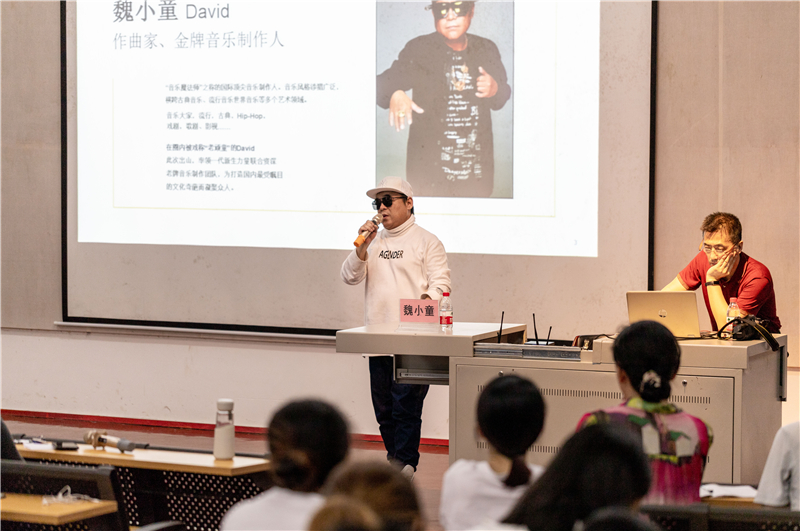 随后,魏小童先生借用毛主席在延安发表的一句话:“洋为中用、古为今用”告诫同学们,音乐的道路要不断地继承、发展与创新。我们既要借鉴西方音乐的经验,学习西方音乐的技术,并学以致用,去传达属于我们中国的音乐故事。魏小童先生又以《青衣意蕴》为例,向大家介绍了中国京剧与西方歌剧相结合的成功案例,并强调在中西方音乐碰撞时,要在尊重西方作品的基础上进行二次创作,保留中西方的音乐特色,突出中国音乐的灵魂,创造出全新的、符合时代潮流的音乐。