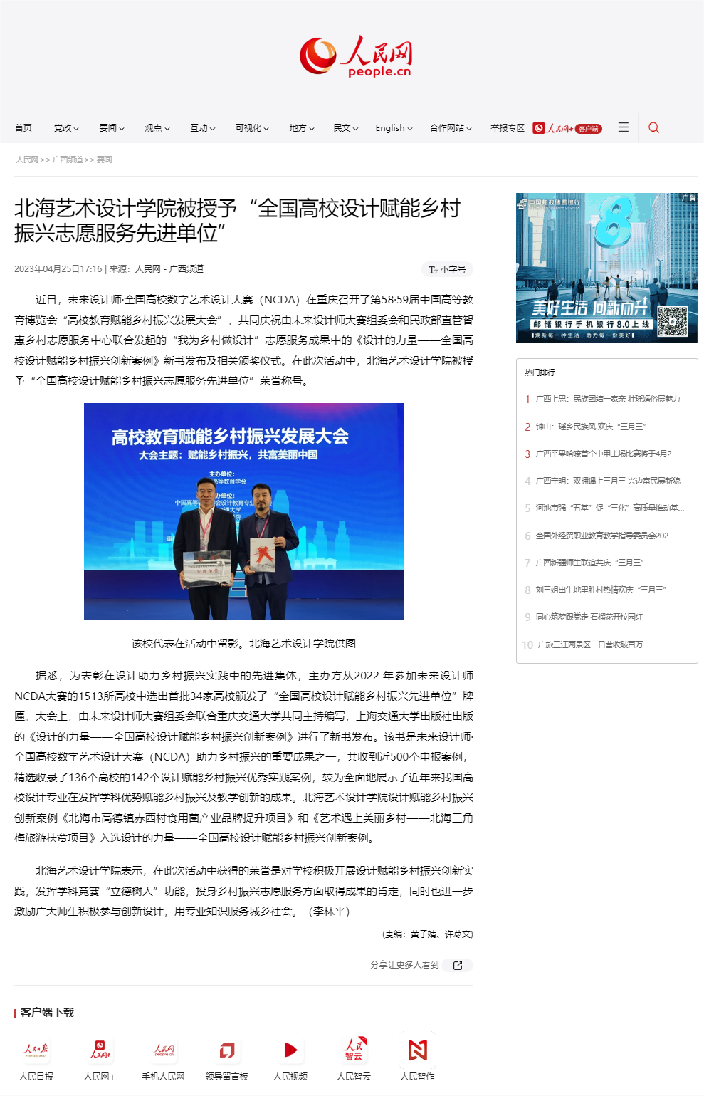 人民网:北海艺术设计学院被授予“全国高校设计赋能乡村振兴志愿服务先进单位”