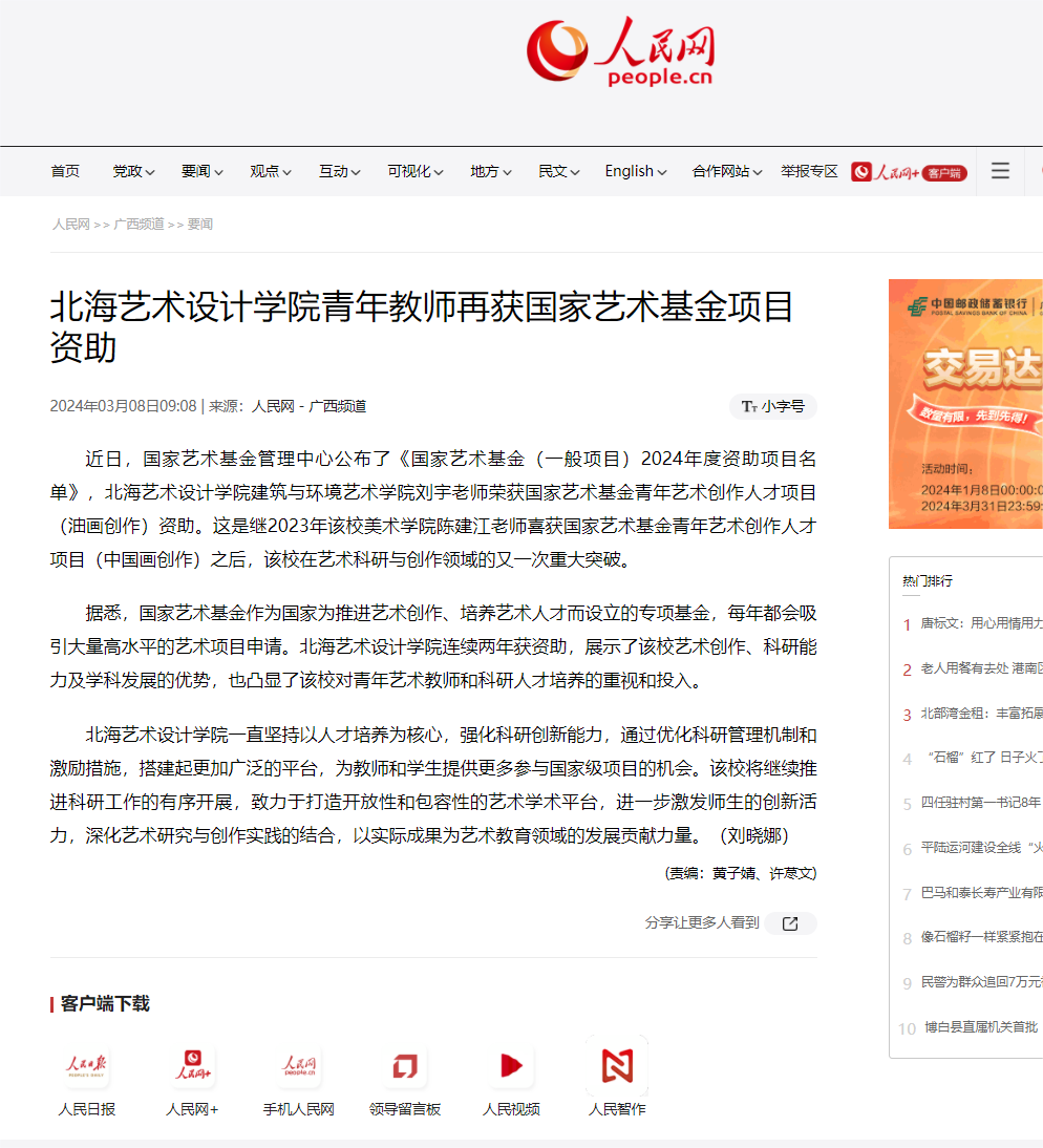 人民网:北海艺术设计学院青年教师再获国家艺术基金项目资助