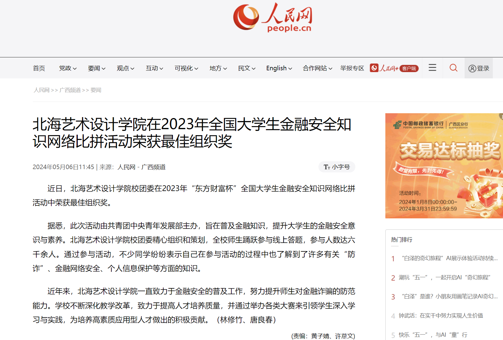 人民网:北海艺术设计学院在2023年全国大学生金融安全知识网络比拼活动荣获最佳组织奖