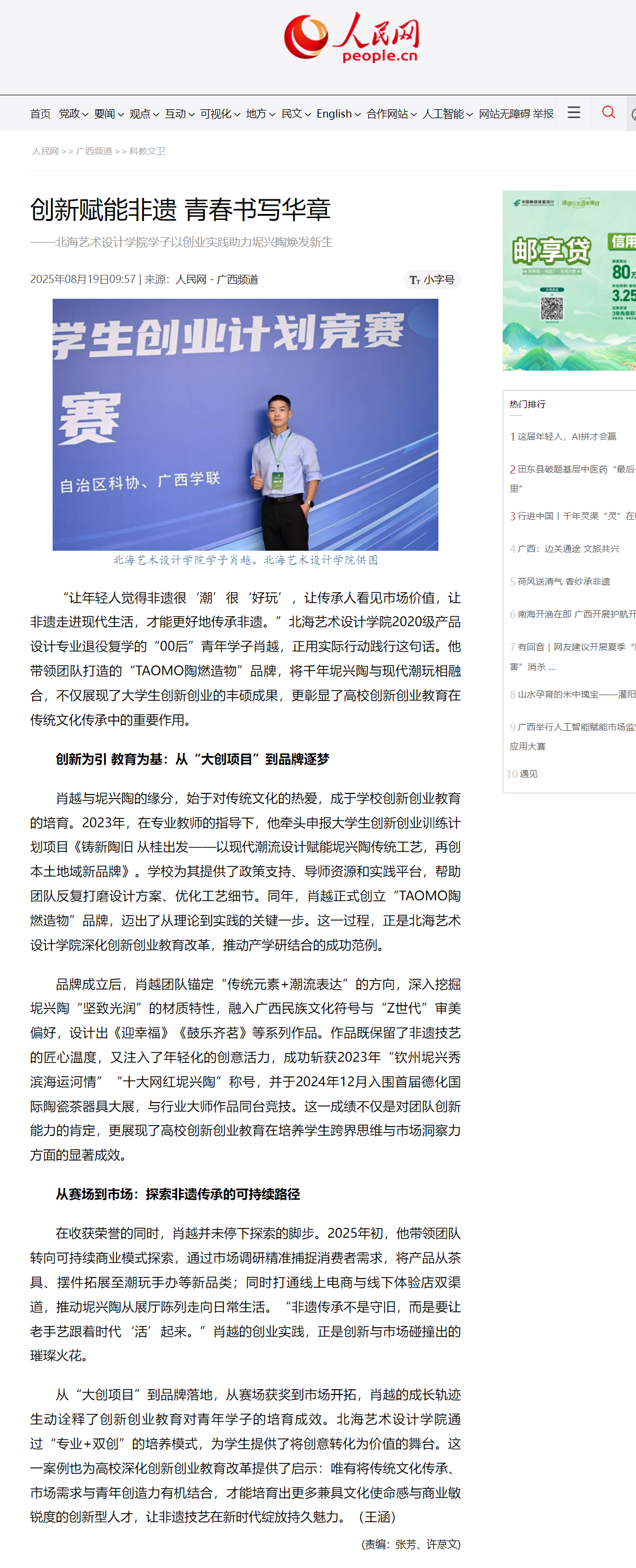 人民网:创新赋能非遗 青春书写华章——北海艺术设计学院学子以创业实践助力坭兴陶焕发新生