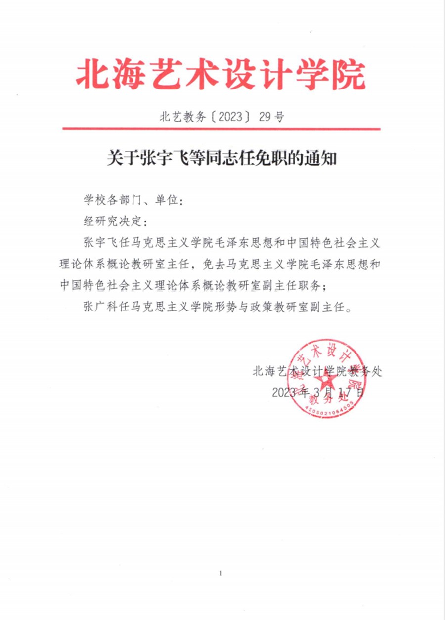 北艺教务〔2023〕29 号关于张宇飞等同志任免职的通知