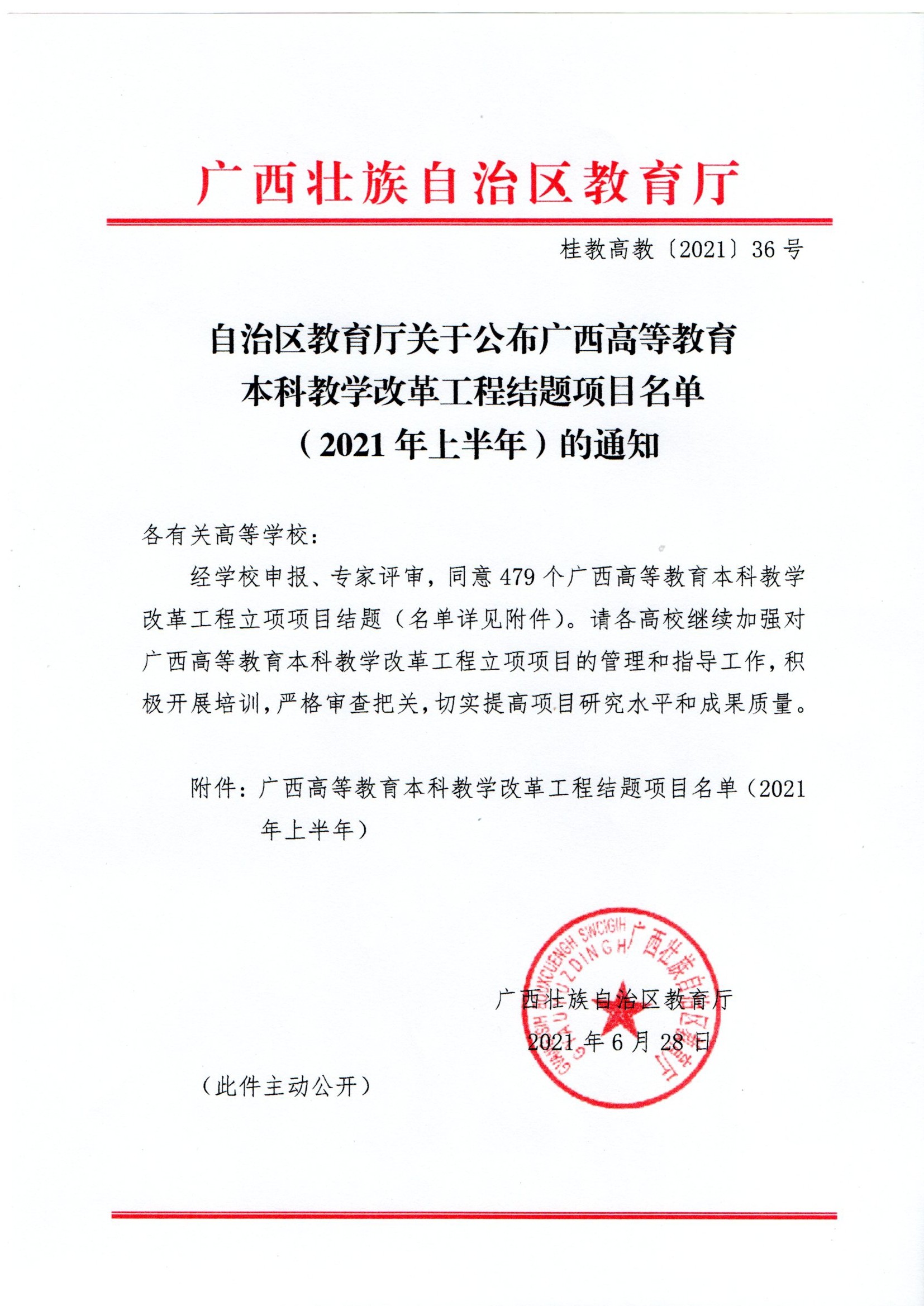 自治区教育厅关于公布广西高等教育本科教学改革工程结题项目名单(2021年上半年)的通知