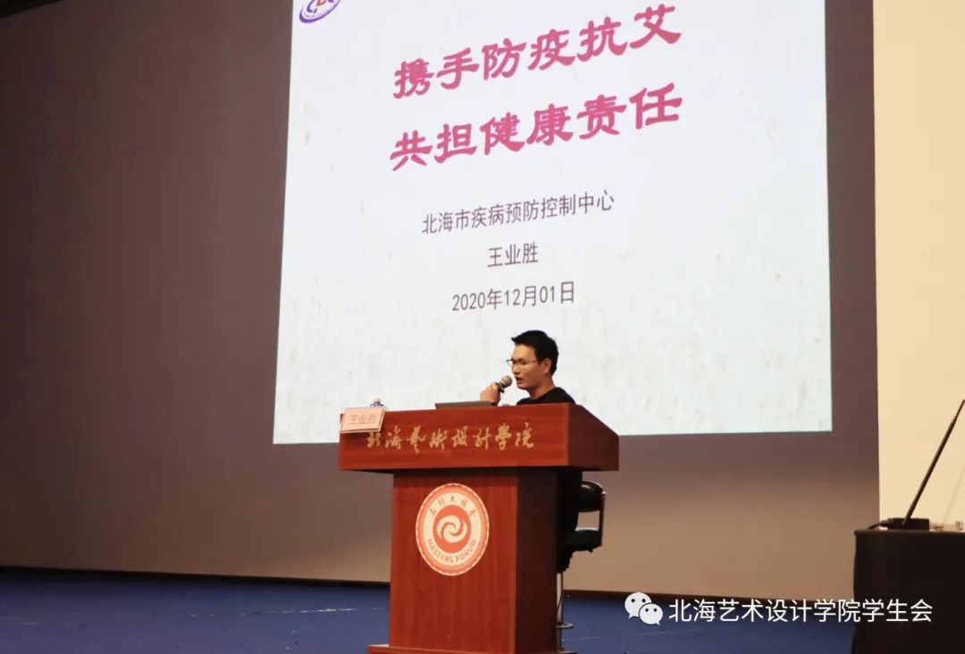 2020年12月1日,由北海艺术设计学院主办、校团委青年志愿者协会承办的世界艾滋病日防艾宣传主题活动正式拉开序幕。相关的摆摊宣传活动于东校区图书馆、东校区学生公寓二栋楼下、西校区食堂门口、西校区大礼堂门口、11栋女生宿舍楼下进行。艾滋病知识讲座于当日19:30在西校区大礼堂进行。