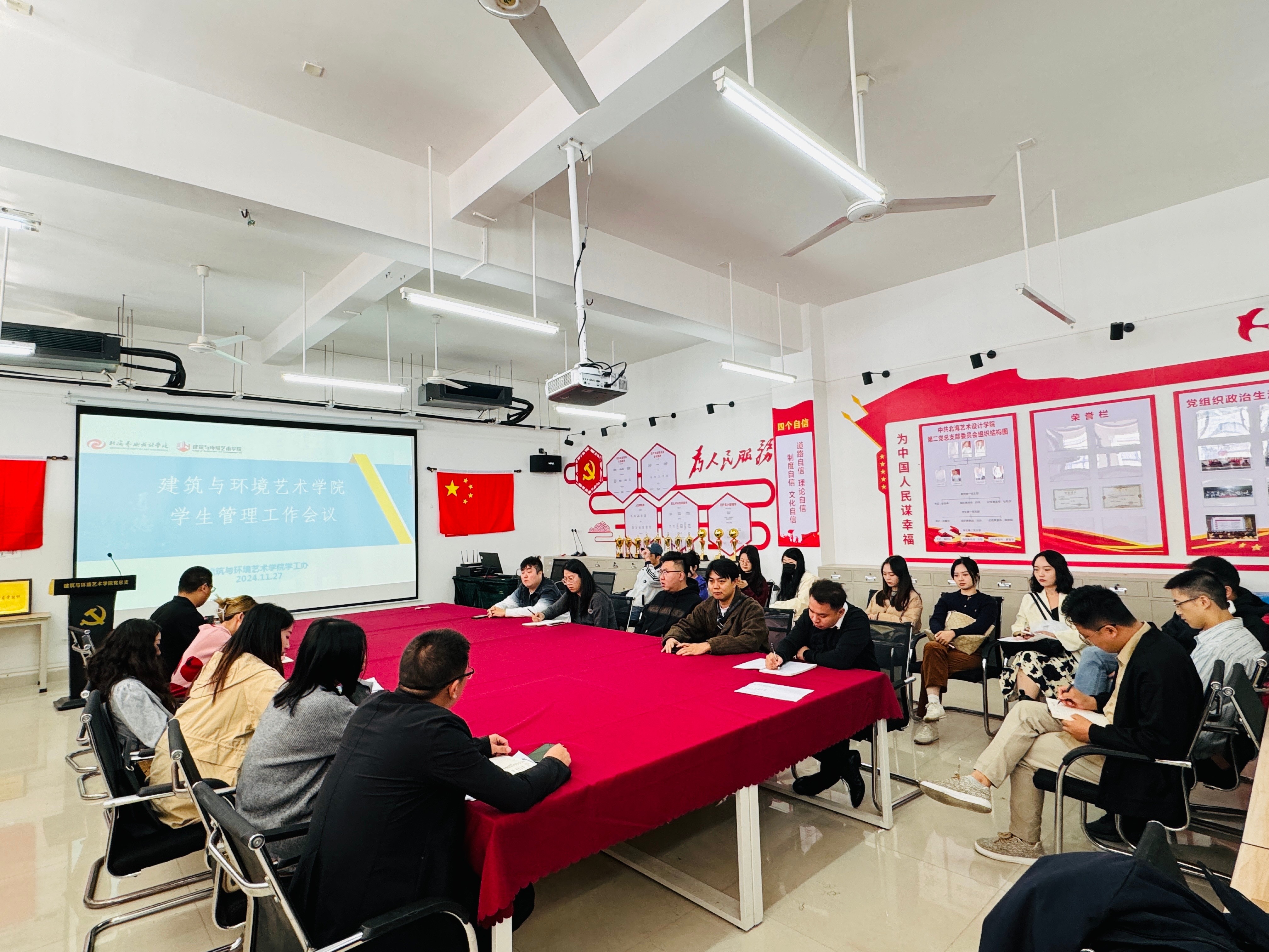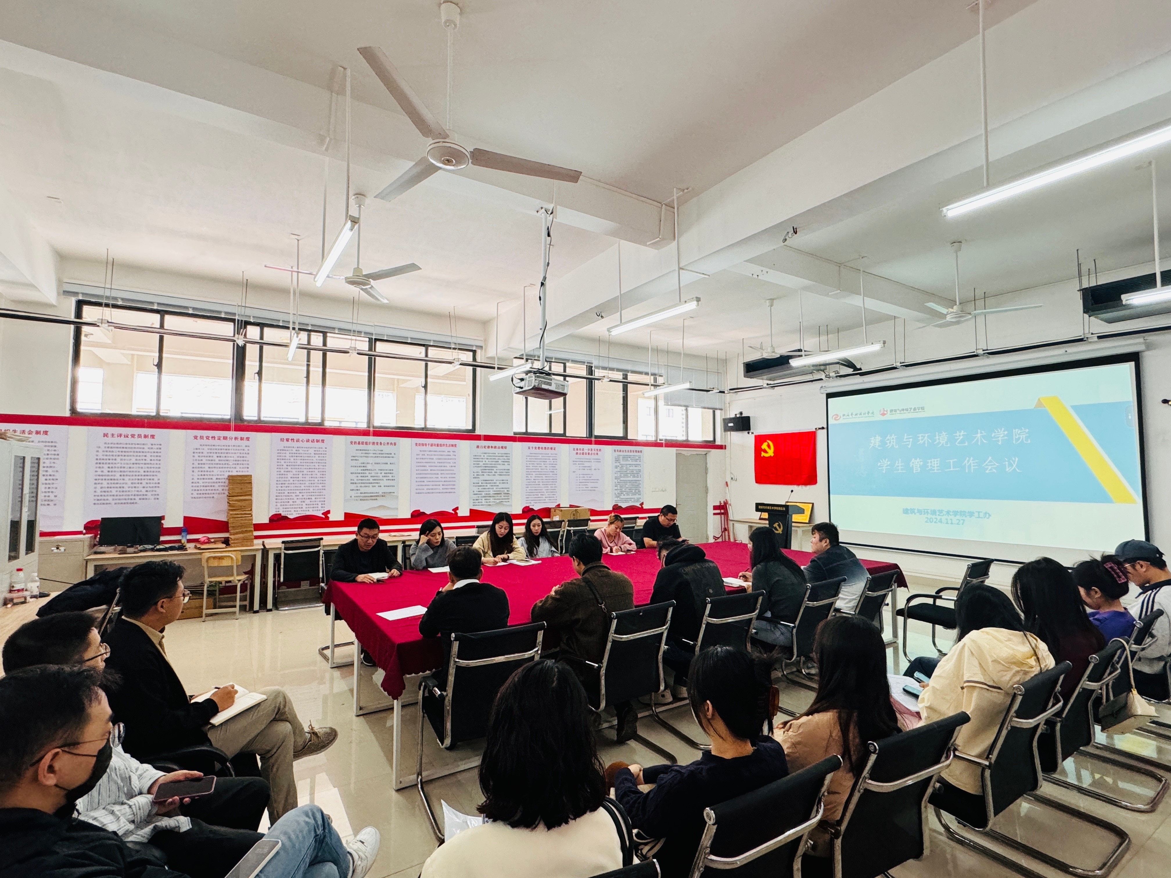 2024年11月27日,建筑与环境艺术学院学工期中学生管理工作会议在公德楼507会议室召开。本次会议由建筑与环境艺术学院党总支副书记曲玥和学工办主任郭溪共同主持,参与会议的人员包括学工办全体成员以及22至24级的年级、班级辅导员。本次会议主要强调以下内容: