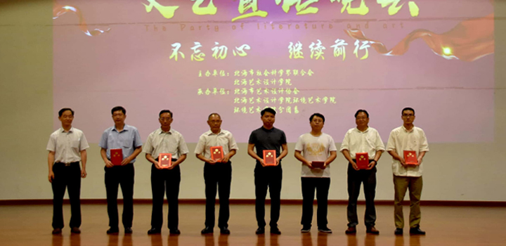 出席本次晚会的领导嘉宾有:北海市社会科学界联合会党组书记,主席伍朝胜;市社科联党组成员,副主席李文红;市社科联科研室科长,宁霞;原北海市政府经济研究中心主任李玉华;原北海市教育科学研究所办公室主任,现任中央民族大学附中北海国际学校校长办公室综合主管刘成学;原合浦县政府办副主任科员现挂任合浦县社科联副主席范翔宇;北海市住房公积金管理中心归集管理科科长谭伟强;北海市心理咨询师协会会长开治中;北海市艺术设计协会秘书长,李敬义;北海艺术设计学院环境艺术学院副院长王明森;北海艺术设计学院美术学院副院长唐海;北海艺术设计学院环境艺术学院副院长王文刚。本次晚会由史昕桐老师主持。