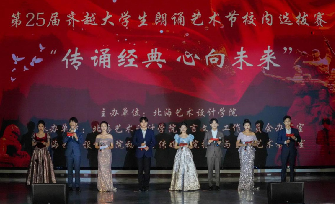 近日,“传诵经典 心向未来” 第二十五届齐越朗诵艺术节北海艺术设计学院选拔赛在西校区大礼堂圆满落幕。本次比赛由北海艺术设计学院主办,学校语言文字工作委员会办公室和动画与传媒学院播音与主持艺术教研室共同承办,学校副校长陶立阳、包建明,教务处处长武鹏程,动画与传媒学院党总支书记张帆,院长孙永辉,党总支副书记黄强红等学院领导出席本次大赛。