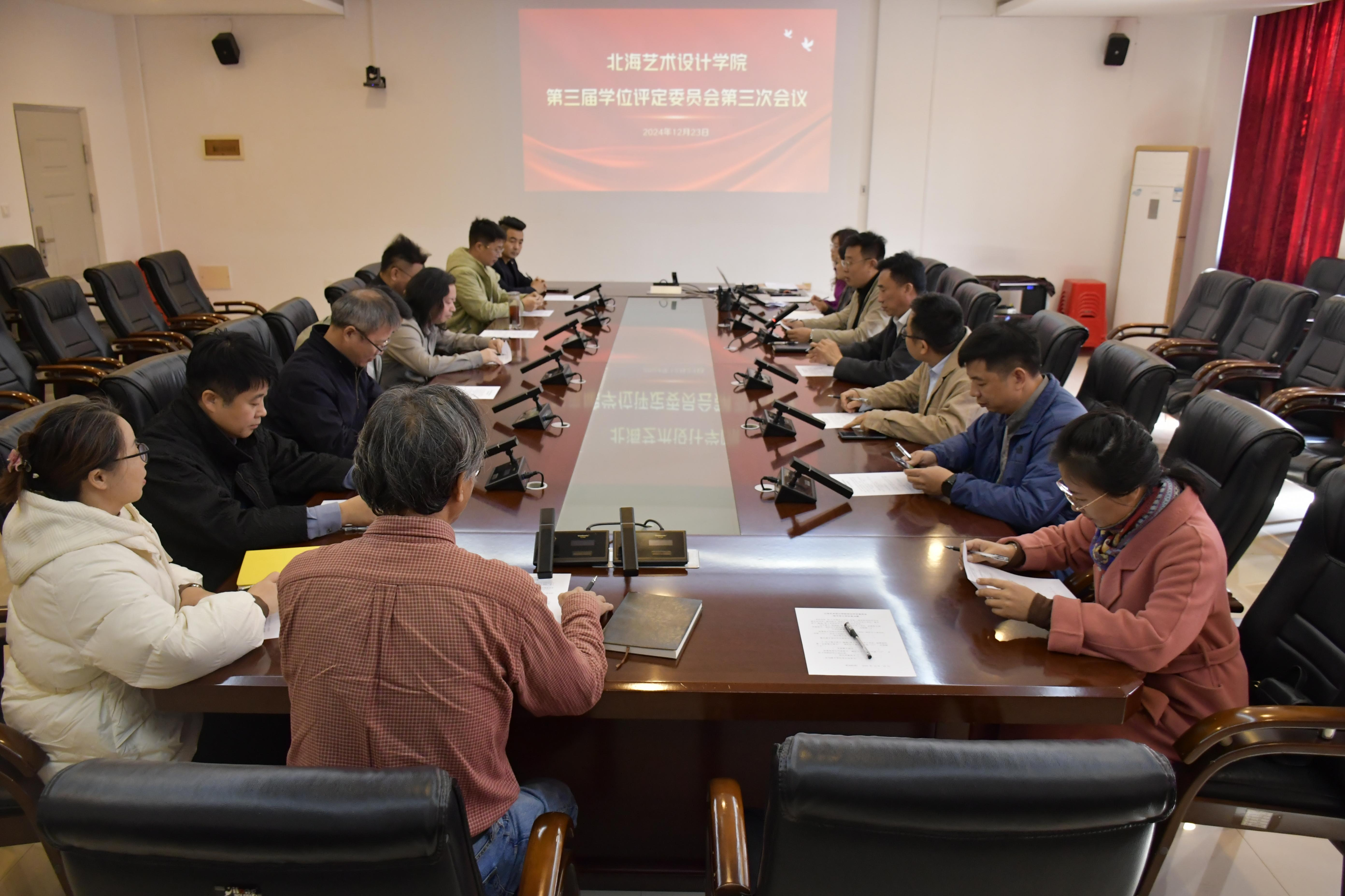 2024年12月23日上午,北海艺术设计学院第三届学位评定委员会第三次会议在行政楼212召开。校学位评定委员会委员共15人出席会议,教务处相关负责人参加会议。校学位评定委员会主席、校长卢新华主持会议。