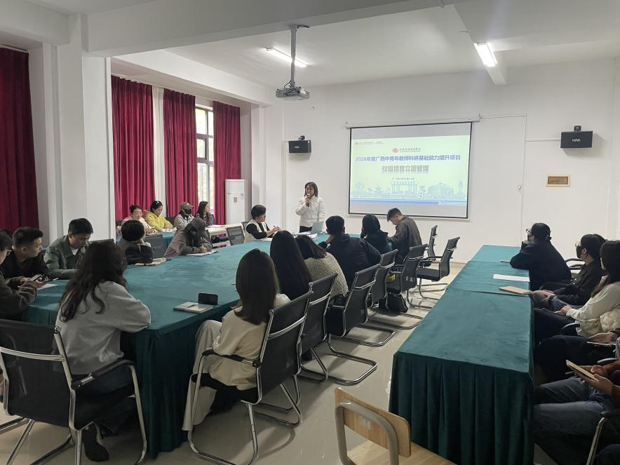 为进一步规范科研项目管理流程,夯实课题研究基础,助力教师科研能力稳步提升,2026年1 月14 日,科研处在行政楼召开 2026 年度广西中青年教师科研基础能力提升项目校级培育立项管理会议。本年度新获立项的课题主持人及两项新立广西教育科学规划课题的负责人参会,会议聚焦课题全流程管理要求,为后续研究工作有序开展筑牢保障。