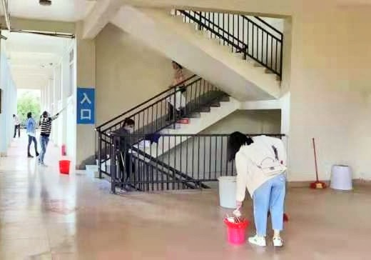 2月24日,在人文学院副院长李水亮指挥领带下,由院办牵头,组织全院教师对学校责任分管区域的办公室楼层,T型楼3楼的教室内外的门窗,墙面,走廊,栏杆,地面,楼梯等公共区域等进行大扫除。教室内设布置,物品摆放整齐,电器及线路进行安全隐患排除,认真排查教学的设施设备,做到发现问题并及时反馈学校相关部门。对分工的楼层防疫标识进行排查及时更换。在卫生清洁过程中,我们学院全体教师积极参与,团结协助,认真仔细地检查了清洁区域卫生,确保清除每个卫生死角。把学院责任分工区域卫生环境面貌焕然一新。