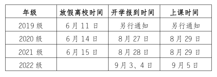 学生6月11日(星期六)至6月15日(星期三)错峰放假。2020级、2021级学生8月27、28日报到,8月29日开始上课;2022级新生9月3、4日报到,9月5日开始上课。