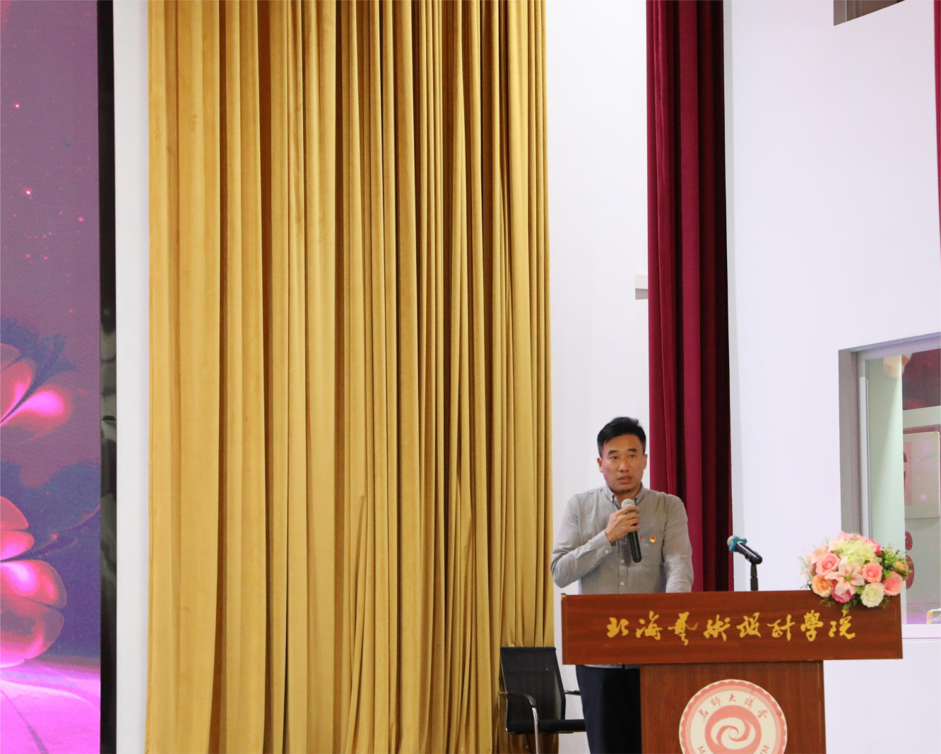 颁奖典礼上,北海艺术设计学院副校长陶立阳发表讲话。陶立阳老师指出此次大赛是结合课程实际,也是“以赛促学,以赛促教”理念的体现,提高了同学们的积极性与主动性。同时,此次大赛还结合了专业知识,引导同学们深刻理解社会主义核心价值观,自觉弘扬中华传统文化,革命文化,社会主义先进文化,全面提高同学们的审美和人文素养,并鼓励同学们要抓住时代机遇,做好中国优秀设计,弘扬中国优秀文化。