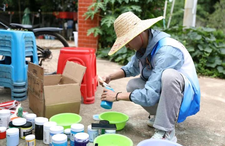 6月16日下午实践活动结束后,在美术学院分团委副书记许荣军老师的带领下,美术学院和各个学院分团委的志愿者们给红锦村村民家中的墙面进行设计与绘画,给枯燥的房子增添了一抹亮丽色彩,为乡村振兴奉献自己的绵薄之力。