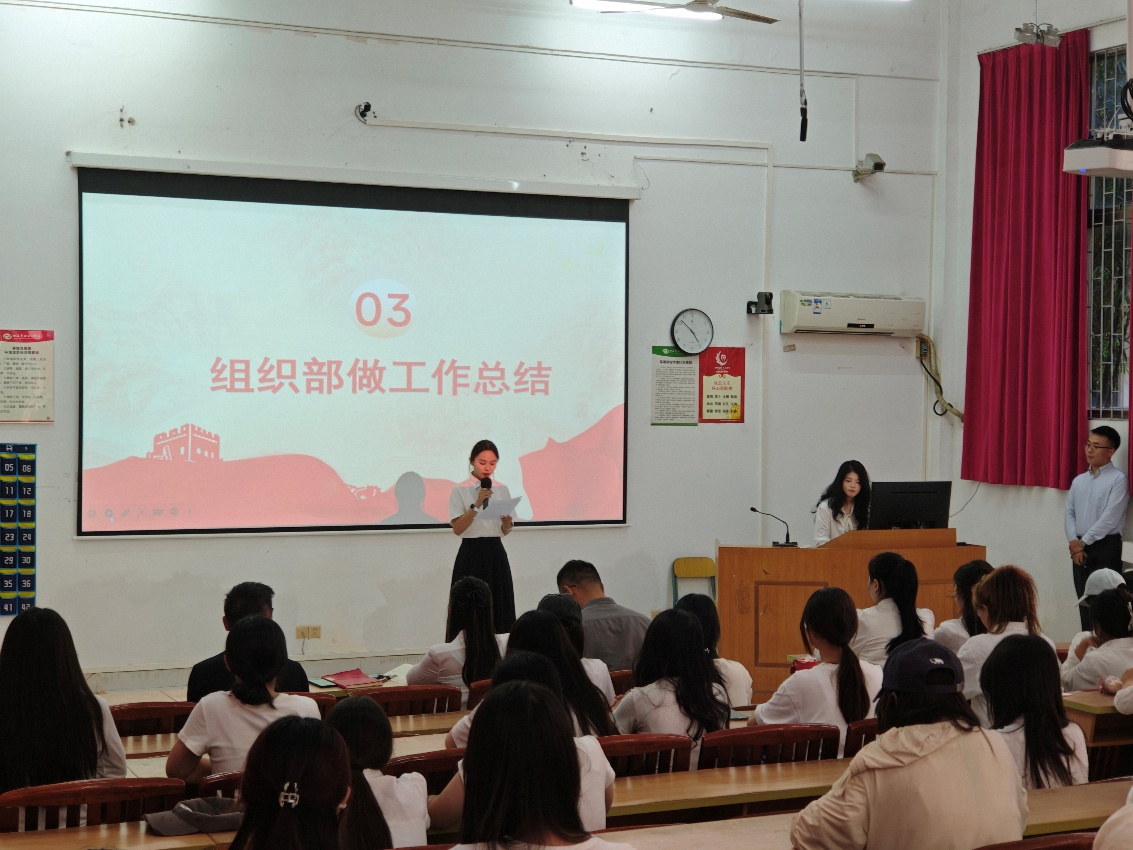 随后,主席团成员与各部门负责人依次登台述职。他们围绕部门职能、品牌活动成果与学期规划进行了系统阐述,充分展现了各部门的工作特色与组织活力。组织部分管主席杨曙瑜重点汇报了团员发展、团籍管理等近期组织建设工作进展,办公室分管主席刘姿则就本年度分团委学生会整体工作计划作了说明。通过他们的汇报,全体成员对分团委学生会的运作机制与未来方向有了更全面的认识,也为后续共同投身工作实践凝聚了思想共识、激发了行动热情。