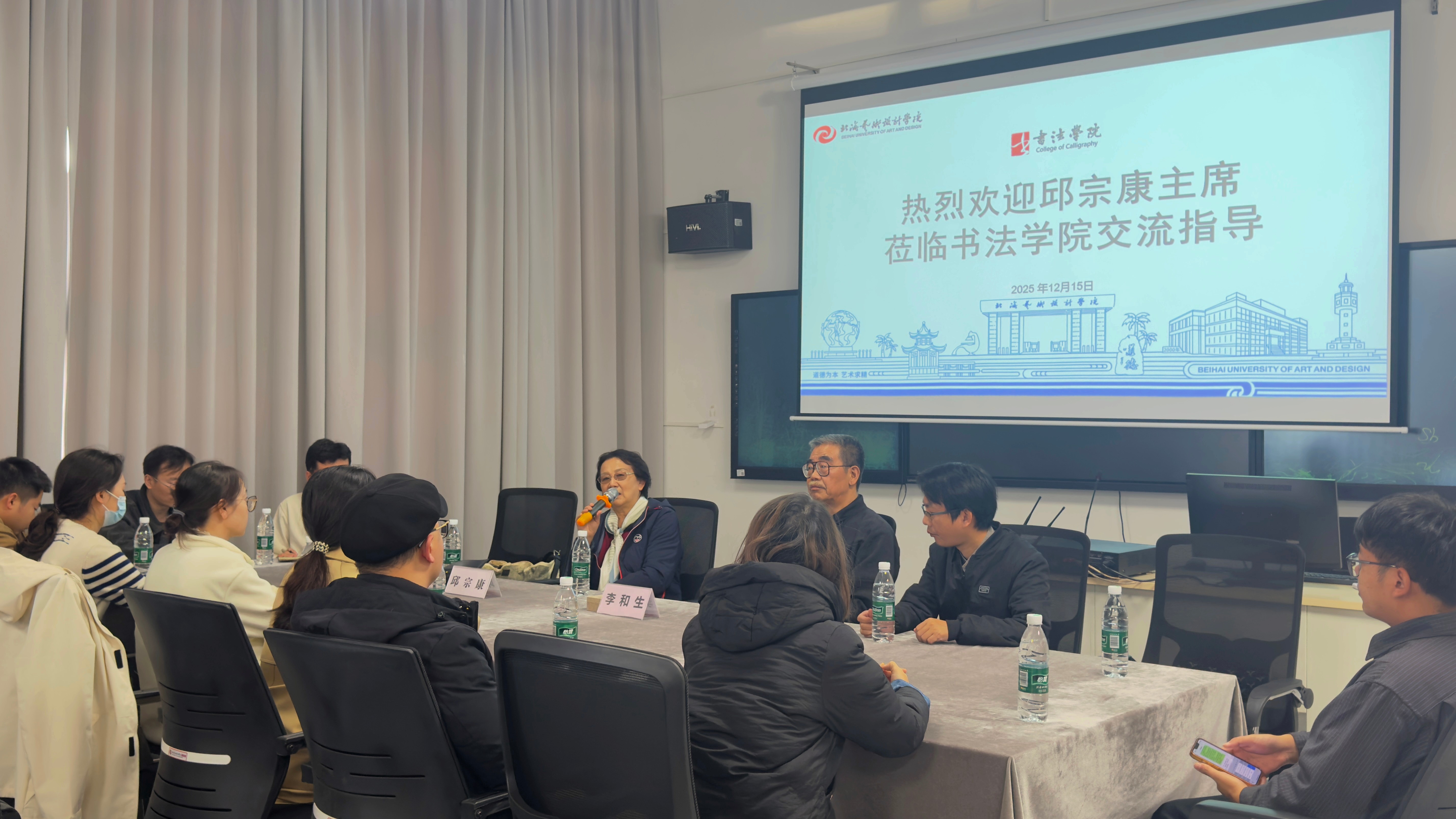 2025年12月15日下午,我院邀请国家一级美术师、中国书法家协会第六届理事、陕西省书法家协会第三届副主席兼秘书长、西安市篆书协会终身名誉会长邱宗康,以及西安市书法家协会第五届副主席、西安美术学院客座教授李和生来院,在艺德楼507书法教研室与教师代表开展书法交流活动。此次活动由书法学院常务副院长苏乃从主持,包含书法艺术座谈会和交流笔会两个环节。