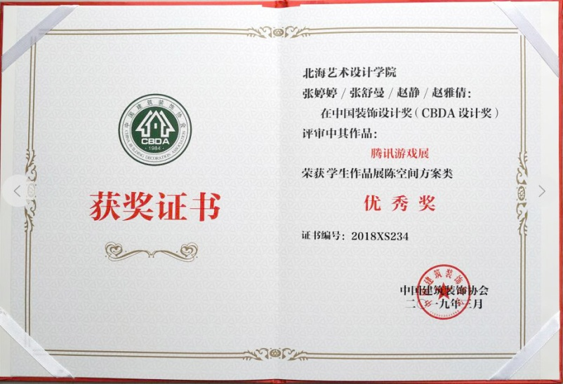 环境艺术学院的课程设计作品在2018年中国建筑装饰设计奖(CBDA设计奖)大赛中获得银奖4项、优秀奖20项;王文刚、周云莉、李二君、张艳、石少平、包美辉、聂明丽、李果男、唐良春老师荣获优秀指导教师奖。作为环境设计行业的龙头协会,行业发 展最具权威性、广泛性、专业性的设计协会,我院学生通过设计大赛的参与,设计能力 得到了肯定。校内课程教学和行业设计竞赛相结合,学生的综合素质得到了较大的提高。