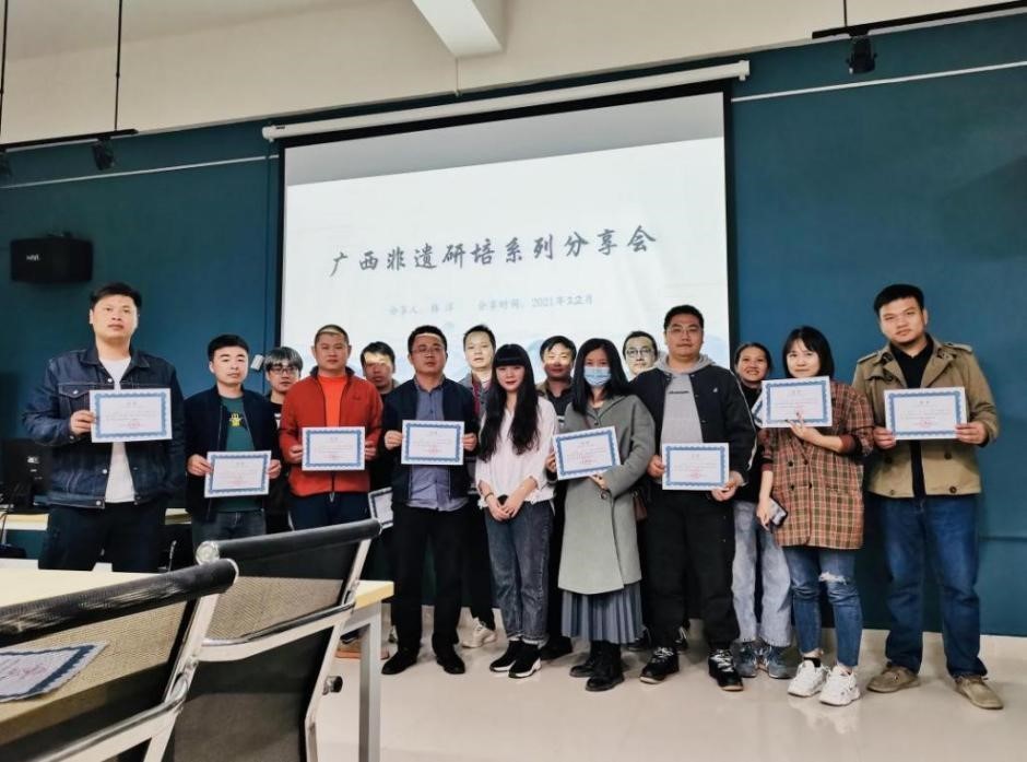 本次非遗分享会,内容丰富,案例清晰。美术学院师生在认真聆听这场“非遗进校园”专题分享会后,韩洋老师与大家进行深入交流,并对所提的问题进行答疑。美术学院师生均表示将以传承我国非物质文化遗产为使命,将传统工艺融合到艺术创作中,在传承中不断创新,坚定文化自信。分享会结束后,龚为院长为到场师生颁发广西文化产业协会传统技艺专业委员会研培证书。大家都期待着更多的“非遗进校园”系列活动走进北海艺术设计学院,走进美术学院。(肖玺 摄)