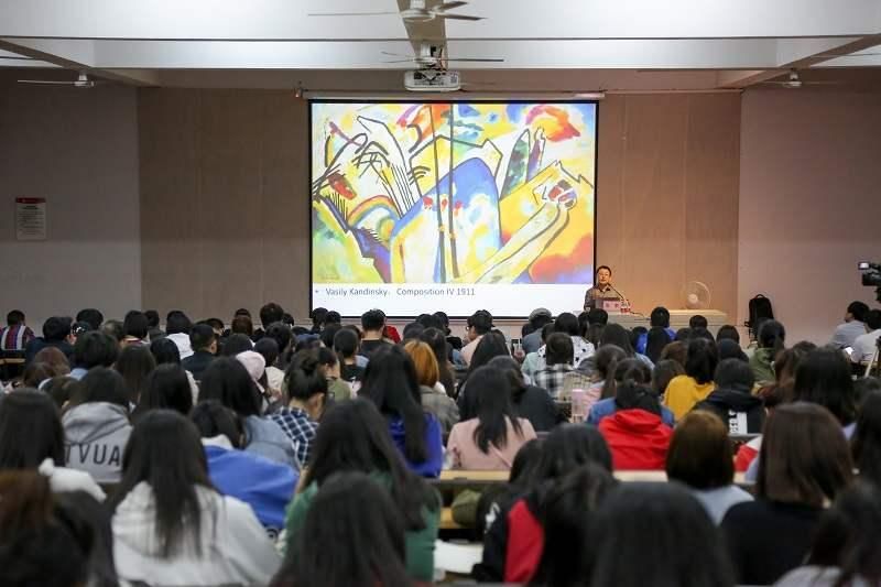 张敢教授通过介绍西方流派作家的作品中的色彩搭配、整体结构,以及作者对生活艺术的感受表达出来,向大家诠释了表现主义的美术思潮,为同学们提供了积累丰富的绘画底蕴;接着又讲述了立体艺术等抽象艺术形式主义的探索和超现实主义的幻想艺术,给人展现出不一样的表达方式。介绍过程中,张敢教授不时运用幽默的话语,引起同学们的一片欢笑声,使得本次讲座更为有趣。
