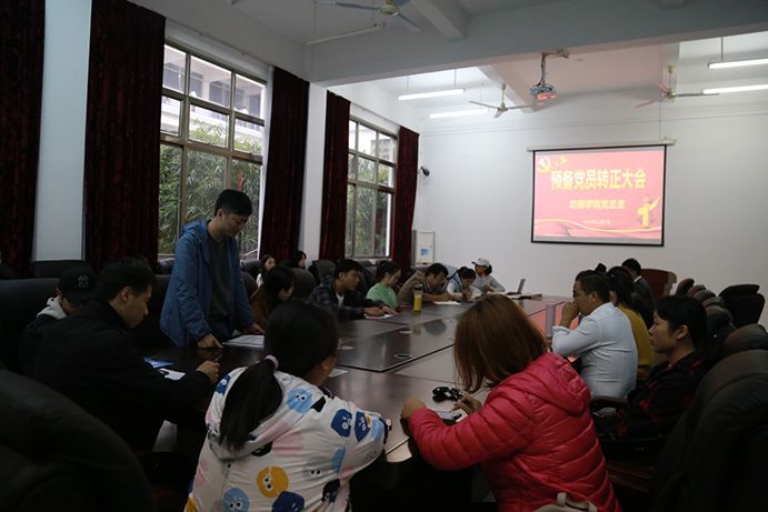 2018127日下午17点,动画学院党总支在东校区综合楼一楼会议室成功召开了预备党员转正大会。会议由党总支副书记罗敏主持,讨论关于黄强红、张茹两名同志申请转为正式党员的问题,党总支书记陶立阳、14名教师党员与13名预备党员出席了会议。