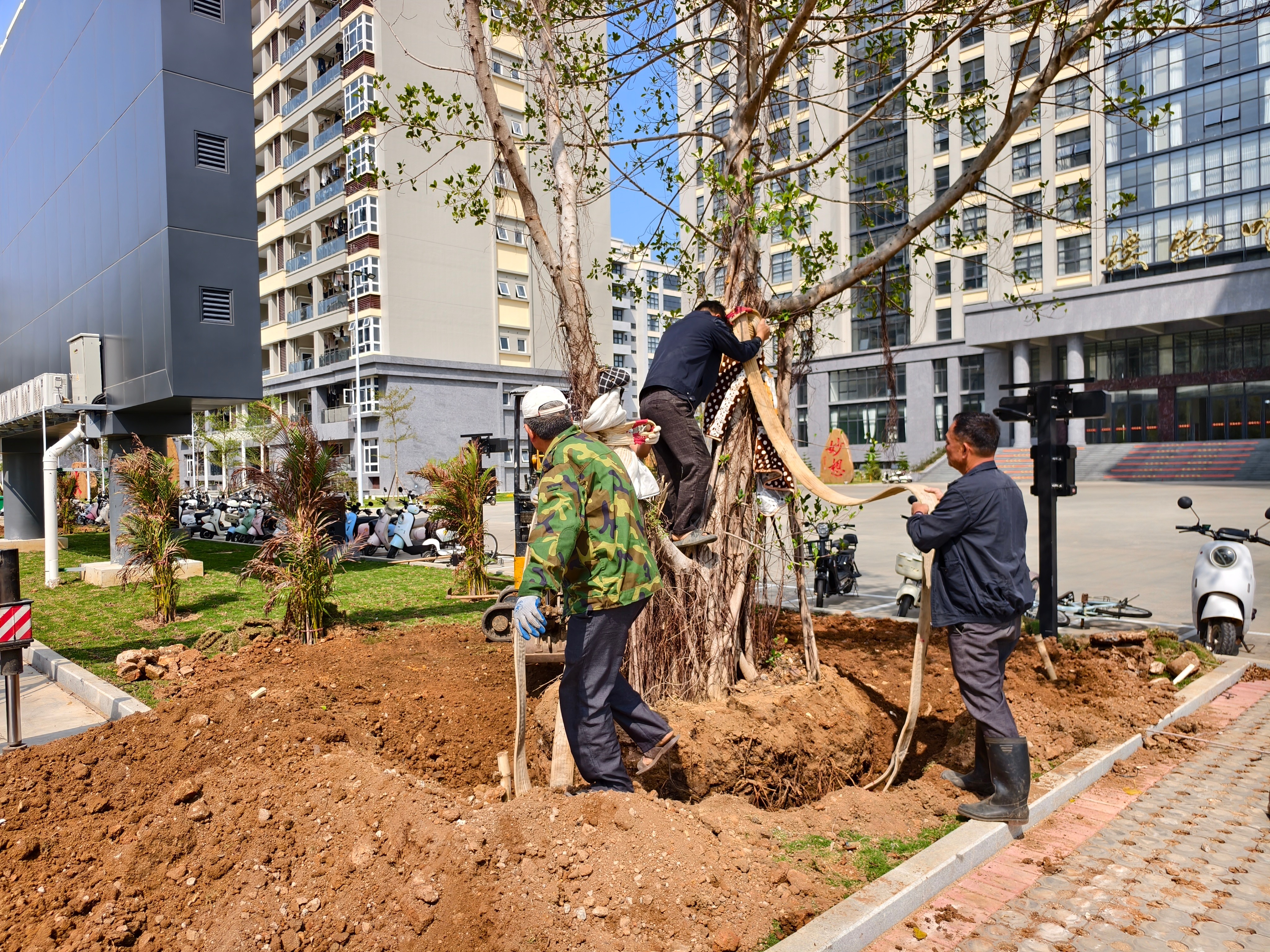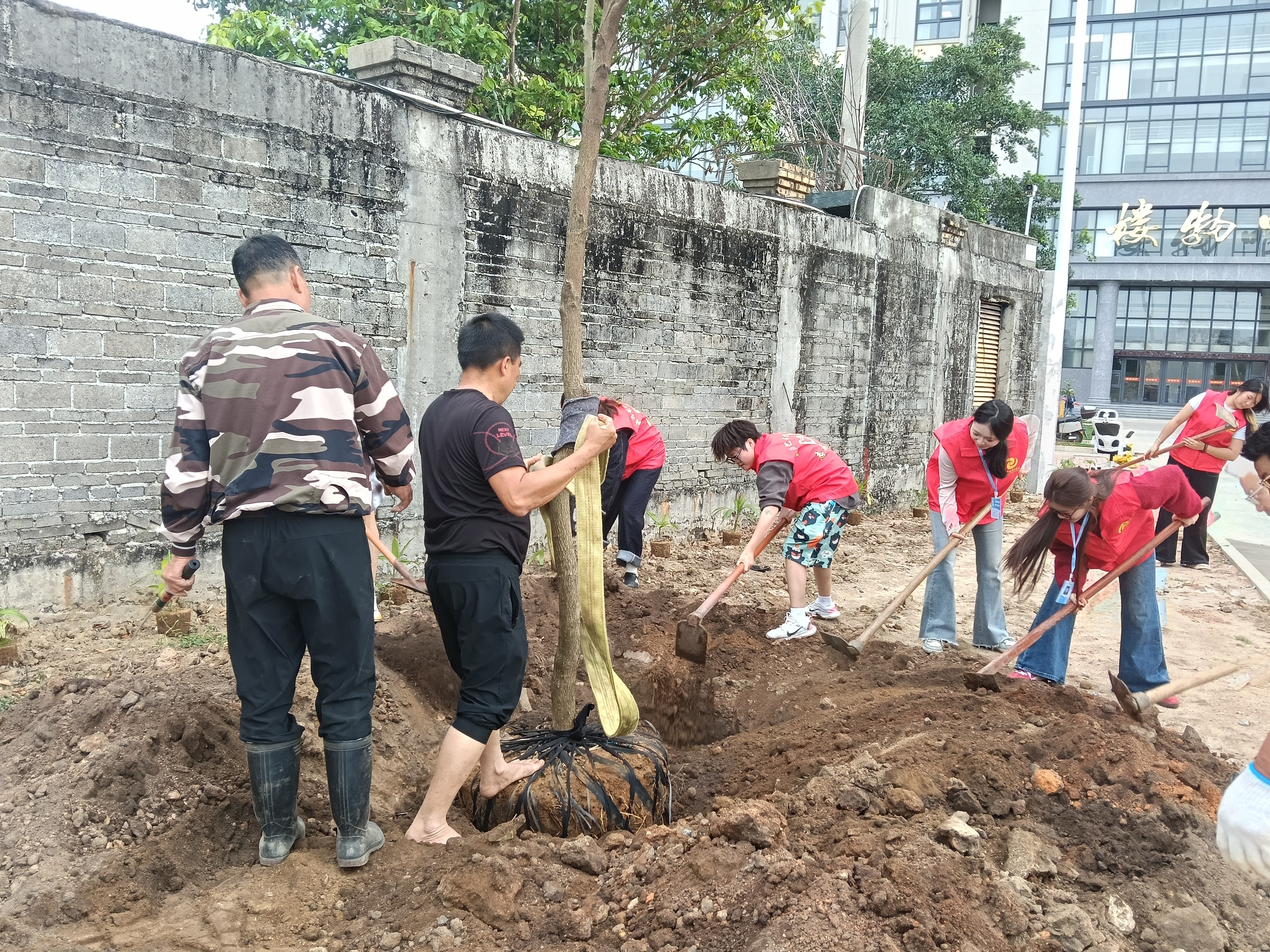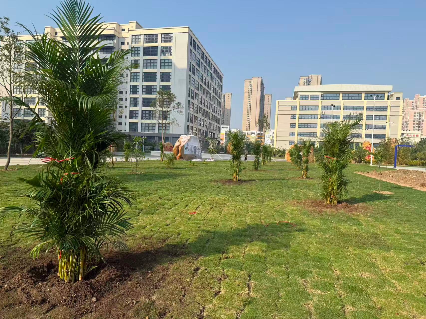 经过一下午的辛勤劳作,22棵香樟树、10株榕树、8棵大皇椰、32株散尾葵迎风挺立、错落有致,在午后阳光下焕发出勃勃生机。香樟树形雄伟、四季常青;榕树枝繁叶茂、冠盖如伞;大皇椰挺拔秀丽、富有热带风情;散尾葵姿态潇洒、叶色翠绿。多种苗木的搭配种植,进一步丰富了南区绿化的层次感和景观效果,为师生营造更加优美宜人的校园环境。