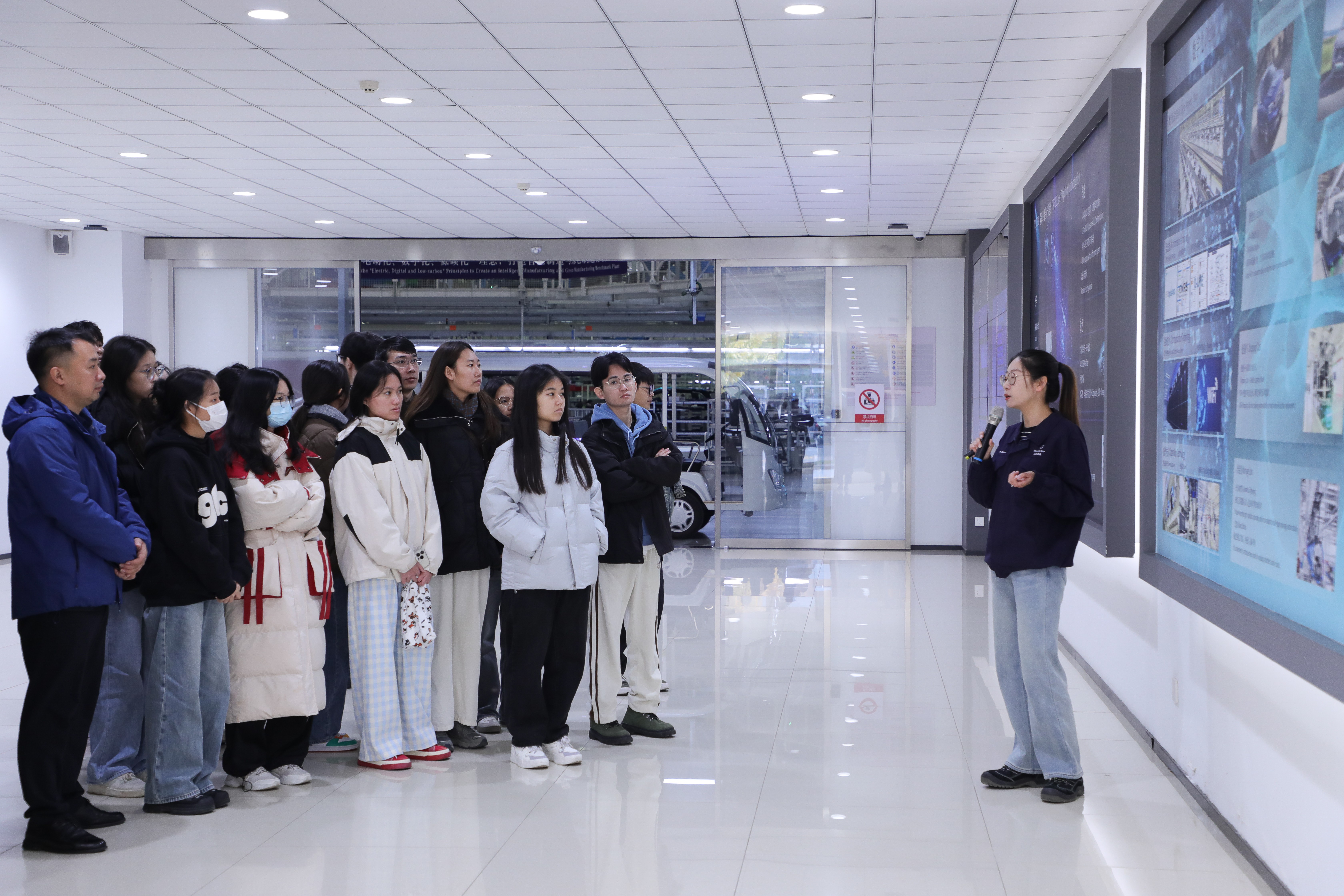 工作人员为师生讲解汽车装配车间构架