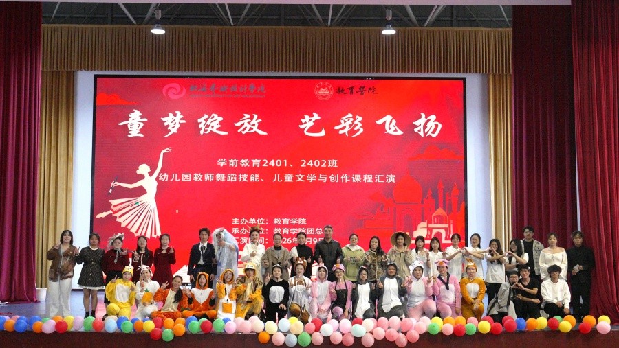 教育学院学前教育专业始终坚持能力导向,以学生发展为中心的理念,通过学训结合的培养模式,将学前教育岗位需求渗透于人才培养全过程,聚焦打造学生突出的艺术创造能力,着力培养其“画、写、说、弹、唱、跳”的综合艺术素养。此次汇报演出以《幼儿园教师舞蹈技能》《儿童文学与创作》两门课程为依托,坚持理论与实践相结合,在教师邓欢、陈美霖的指导下,学前教育专业2024级全体学生综合运用美术、音乐、舞蹈、儿童剧目编排等专业技能,全程参与展演方案策划、节目编排设计、现场布置搭建等环节,通过团队通力协作,圆满完成结课成果汇报。